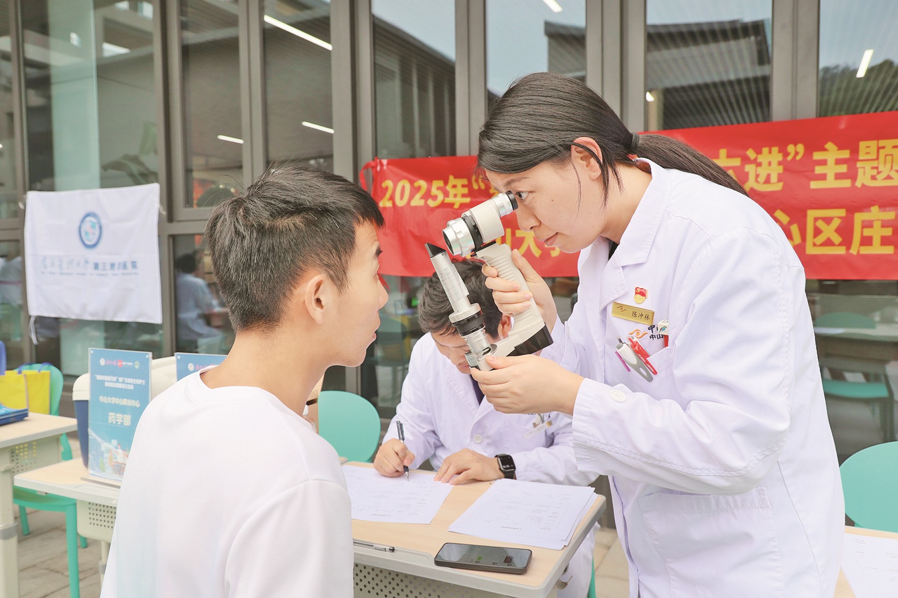 在义诊区,多家医院设置咨询摊位,为师生提供视力检查、脊柱评估、口腔检查、营养指导等多项服务。现场摆放的相关物品吸引不少学生驻足。“气味好闻,还能温和祛寒。”医务人员的讲解让同学们对中医药文化产生浓厚兴趣。针对口腔保护的专项问卷和科普,也让同学们更加重视日常牙齿护理。