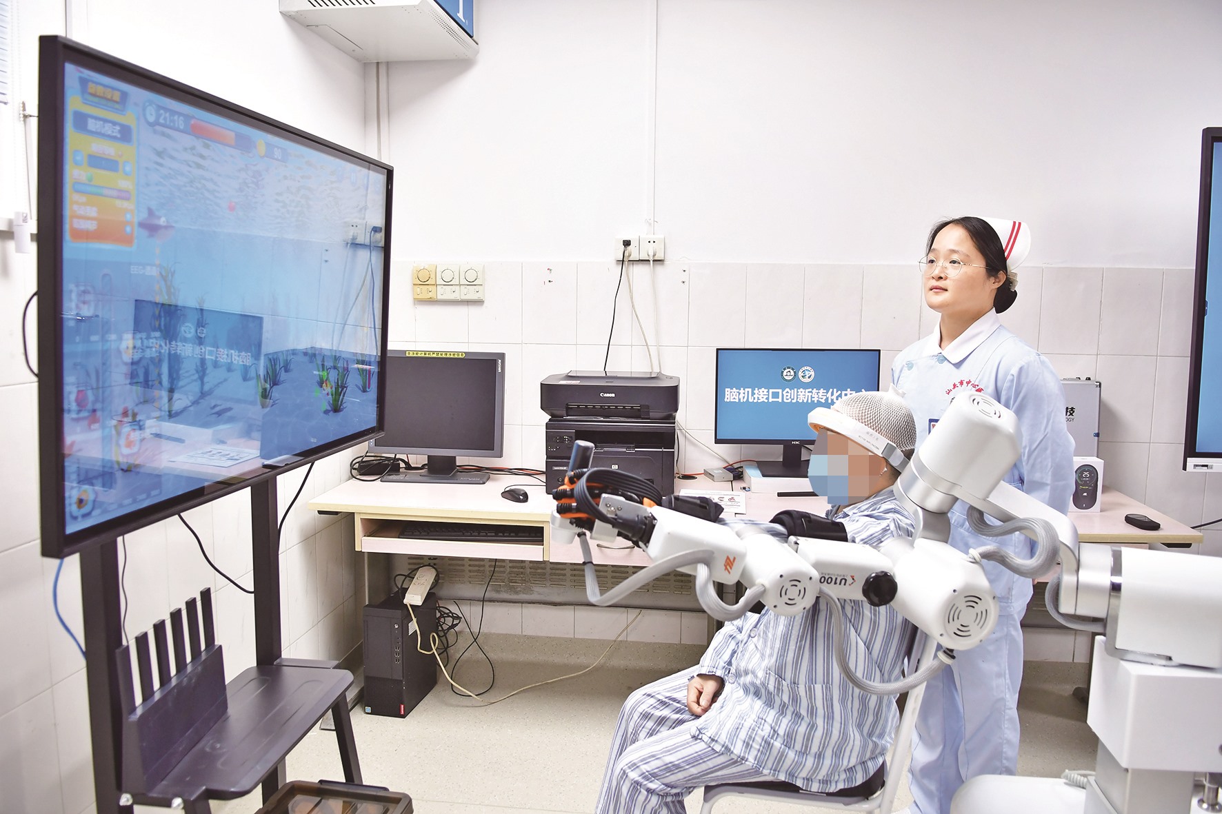 日前,粤东地区首次实现脑机接口临床转化落地,汕头市中心医院率先启用脑机接口病房,同步成立暨南大学汕头临床医学院脑机接口创新转化中心。这一前沿科技与医疗健康深度融合,将为神经疾病患者带来治疗、康复的新体验。活动当天,在该院神经外科一病区里,三位术后无法完全自如运动的病人体验不同类型的康复机器人,在机器指引下想象躯体运动,并在机器帮助下实现运动康复。这些场景背后,正是前沿脑机接口技术的实际应用。