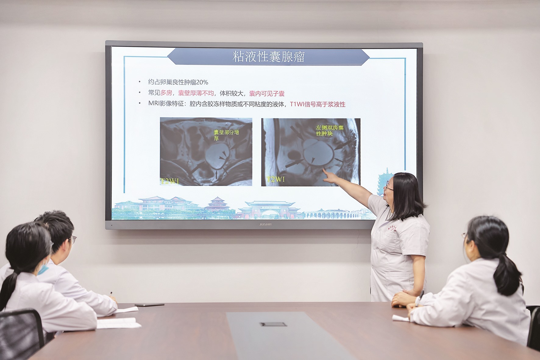 在她的指导下,曲江区人民医院影像诊断实现从“描述病灶”到“指导治疗”的跨越。此前,一名患者因外院检查发现大量腹水就诊,增强CT提示卵巢区域占位。按照传统模式,影像报告仅作病灶描述,而在陈瑞莹的带领下,团队深入分析影像细节,最终在报告中明确指出“肿瘤与邻近乙状结肠肠壁分界不清,肝内可见多发转移灶,腹膜后淋巴结增大,腹盆腔积液增多”等关键信息,为临床精准分期、制定治疗方案提供重要依据。“这样的报告,让分期更准确、治疗方向更明确。”临床医生的反馈,正是对帮扶成效的最佳认可。