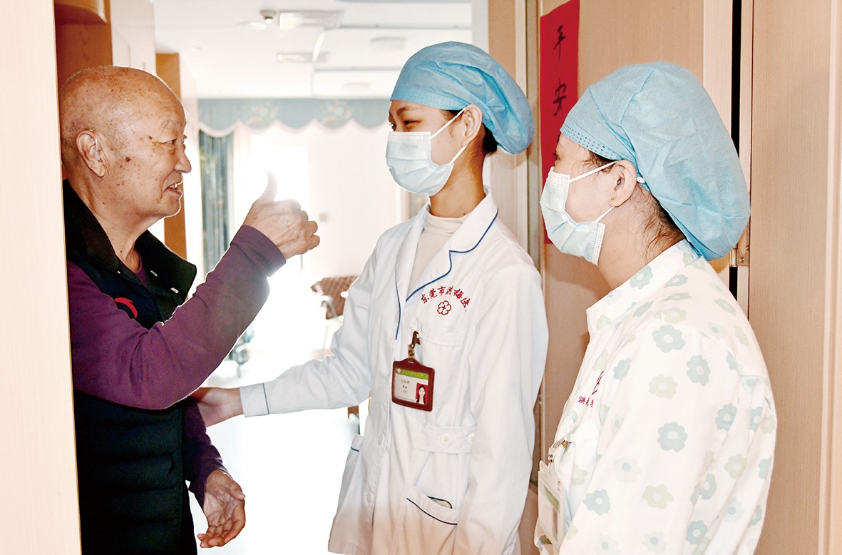 为了给予老人全方位护理保障,护理院以“医养一张床”模式,用专业团队与闭环服务,打破了医疗与养老的壁垒。不仅组建由党员担任小组长的认知障碍、伤口造口、安宁疗护等8大护理特色专科小组,还组建由党员担任队长,由医师、护师、心理咨询师、康复理疗师、社工师、养老评估师、健康管理师、营养师等多学科组成的9师团队,为老人提供一年365天,每天24小时的分级护理服务。